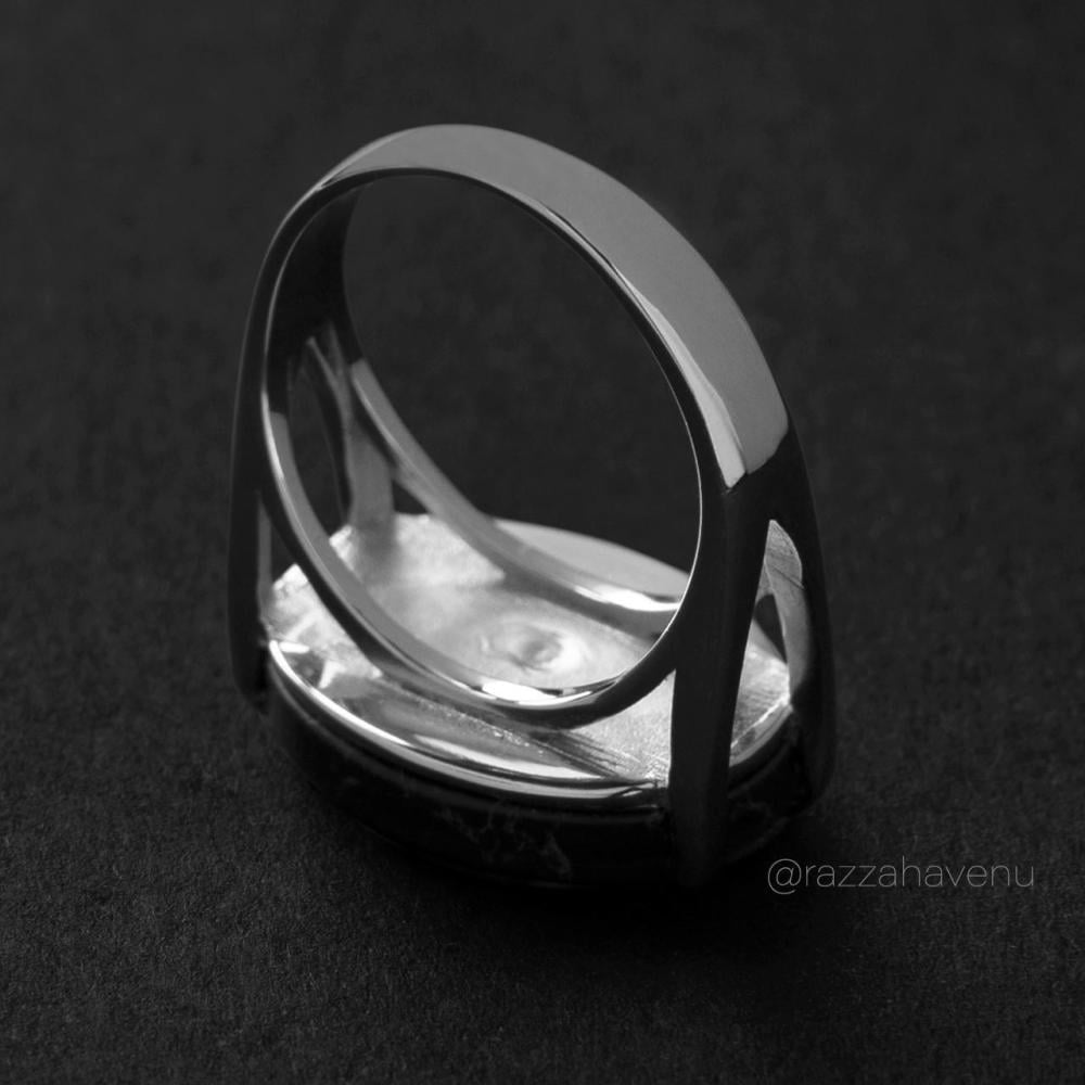 خاتم ملكي من الفضة عيار 925 بتصميم كلاسيكي رائع ، يتوسطه حجر أنيق يضيف لمسة من الفخامة ، المقابض الدقيقة تمنح الخاتم توازنًا مثاليًا بين الأناقة والتميز